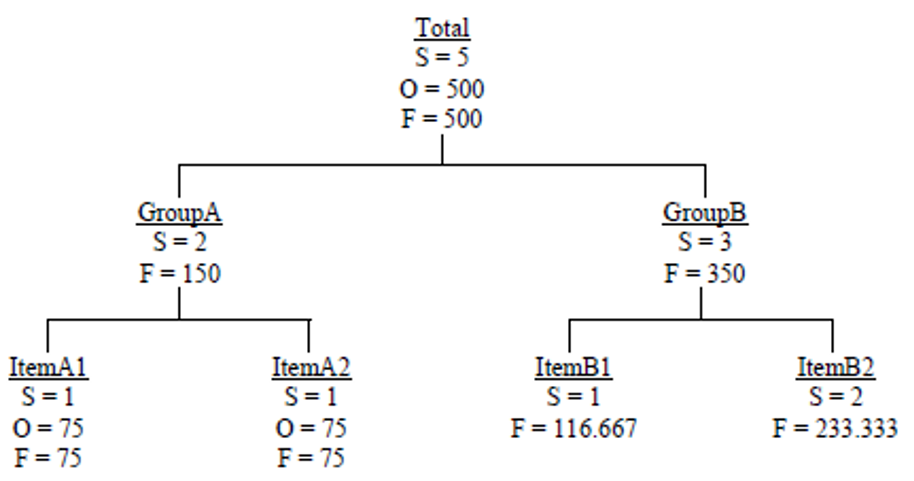 כיוון שאילצנו את קבוצה A לקבל 150 (במקום 200 , כיוון ששני הפריטים בקבוצה נקבעו על 75 כל אחד) שינתה המערכת את היחס בהתאם ולקבוצה B הוגדרו 350 פריטים ולמוצרי הקבוצה הוגדרה התחזית בהתאם ליחס התחזית הסטטיסטית